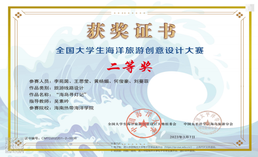 近日,2022年全国老员工海洋旅游创意设计大赛获奖名单揭晓,我院员工李苑茵团队提交的旅游路线设计参赛作品《海岛寻灯记》(指导老师:吴素吟)荣获二等奖!