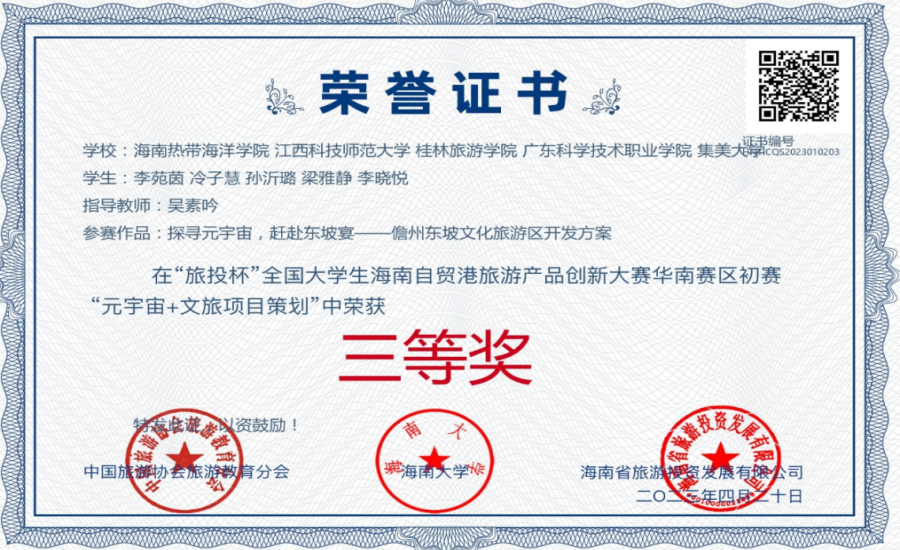 近日,“旅投杯”全国老员工海南自贸港旅游产品创新大赛公布初赛结果,我院旅游管理专业员工李苑茵完成的 “元宇宙+文旅项目策划”作品《探寻元宇宙,赶赴东坡宴——儋州东坡文化旅游区》(指导老师:吴素吟)荣获初赛(华南赛区)三等奖!