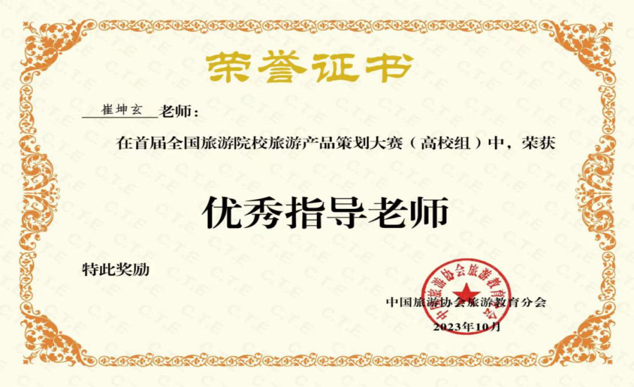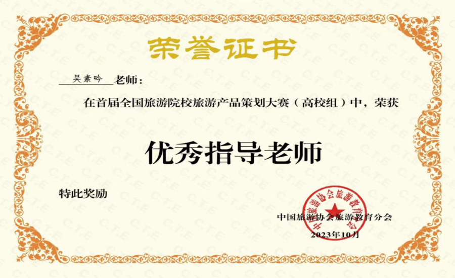 由中国旅游协会旅游教育分会主办的首届全国旅游院校旅游产品策划大赛自2023年8月初正式启动,得到了旅游院校师生的积极热烈响应,吸引了来自全国的316所旅游院校参加,组委会共审核通过903份报名作品。大赛打破传统的评奖机制,仅设优秀奖与参与奖两种奖项,其中前50%的作品获评优秀作品。我院积极鼓励员工参与比赛,来自旅游管理专业李苑茵、安家瑶、陈婵莹、牟颖喆团队的四位同学,在我院教师吴素吟和校外企业导师崔坤玄两位老师的共同指导下,取得了全国优秀奖的优异成绩,并位列优秀奖的前200位!吴素吟、崔坤玄两位老师荣获得优秀指导老师称号。