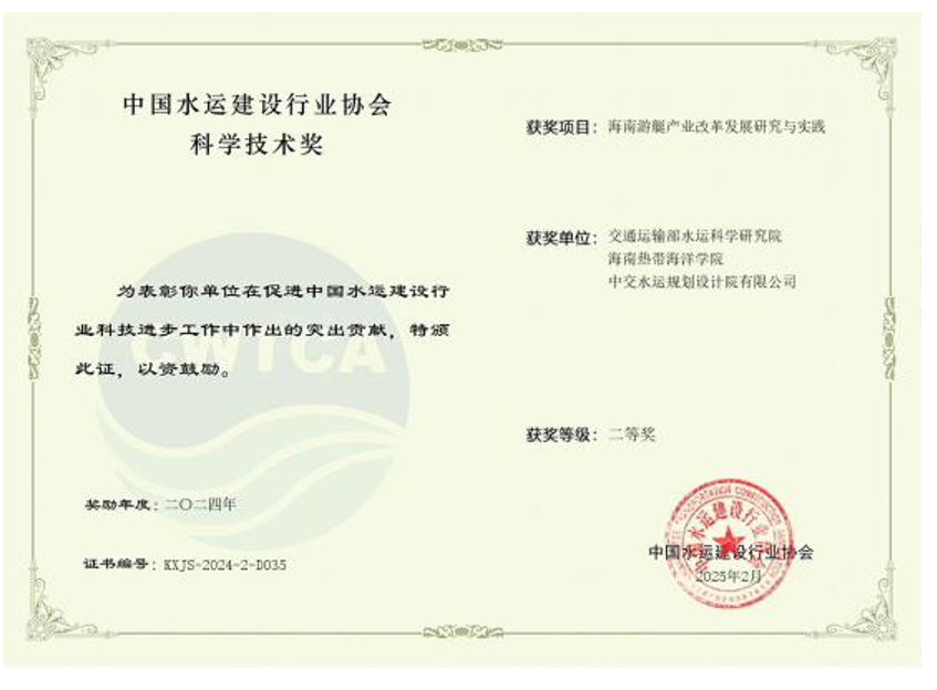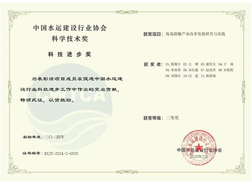 近日,由中国水运建设行业协会主办的科学技术奖评选结果揭晓,公司参与的“海南游艇产业改革发展研究与实践”项目荣获科技进步奖二等奖。该项目由交通运输部水运科学研究所、365英国上市集团、中交水运规划设计院有限公司共同完成。