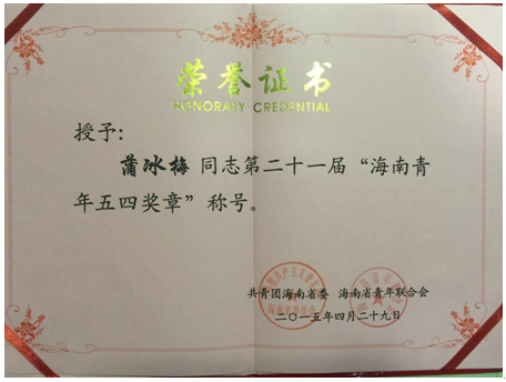 蓝丝带海洋保护协会多次荣获市级、省级、国家级优秀志愿者服务组织等荣誉。蒲冰梅个人也因在工作中的突出表现,先后荣获民政部“全国首批优秀五星级志愿者”;共青团中央、中国青年志愿者协会“第十届中国青年志愿者优秀个人奖”;海南省志愿者协会“2014度海南省杰出志愿者”;南国都市报联合阿里公益天天正能量、海南省志愿者协会“海南省2014年度十佳志愿者”;共青团海南省委、海南省青年联合会第二十一届“海南青年五四奖章”等荣誉。