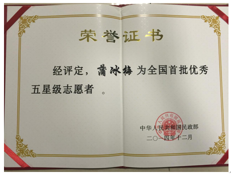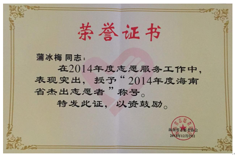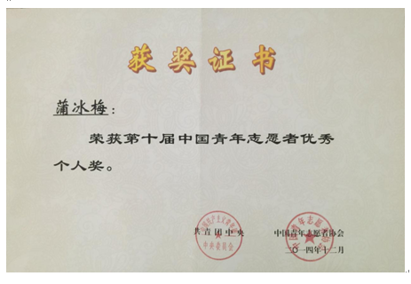 蒲冰梅于2008年从汶川地震募捐活动开始走上志愿服务之路,作为三亚市红十字会志愿者期间多次参加汶川地震灾害募捐工作、青海玉树地震灾害募捐工作、联合国疟疾蚊帐发放工作、急救培训等志愿服务活动。因其在志愿服务工作中的认真表现,获得“三亚市红十字会优秀志愿者”和“海南省抗震救灾优秀志愿者”荣誉称号。